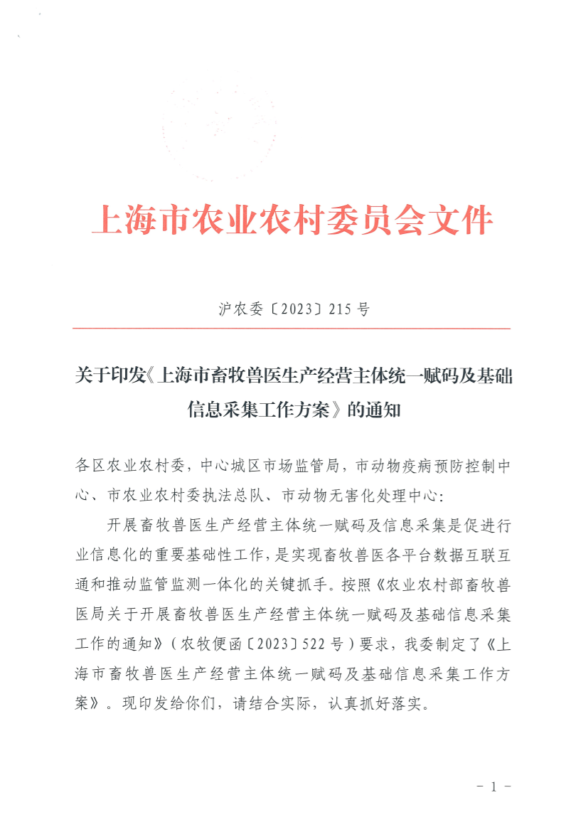 开展畜牧兽医生产经营主体统一赋码及信息采集是促进行业信息化的重要基础性工作,是实现畜牧兽医各平台数据互联互通和推动监管监测一体化的关键抓手。按照《农业农村部畜牧兽医局关于开展畜牧兽医生产经营主体统一赋码及基础信息采集工作的通知》(农牧便函〔2023〕522号)要求,我委制定了《上海市畜牧兽医生产经营主体统一赋码及基础信息采集工作方案》。现印发给你们,请结合实际,认真抓好落实。