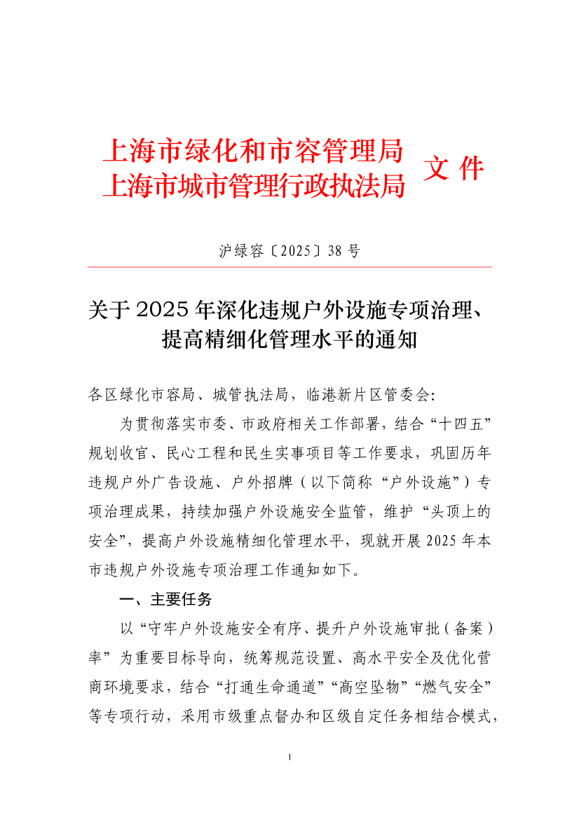 为贯彻落实市委、市政府相关工作部署,结合“十四五”规划收官、民心工程和民生实事项目等工作要求,巩固历年 违规户外广告设施、户外招牌(以下简称“户外设施”)专项治理成果,持续加强户外设施安全监管,维护“头顶上的安全”,提高户外设施精细化管理水平,现就开展 2025 年本市违规户外设施专项治理工作通知如下。