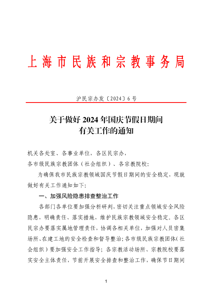 为确保我市民族宗教领域国庆节假日期间的安全稳定,现就做好有关工作通知如下: