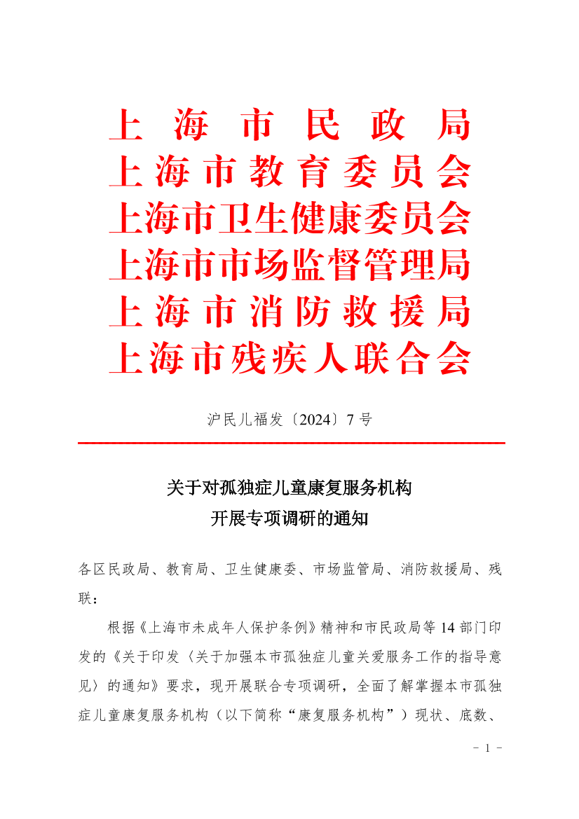 根据《上海市未成年人保护条例》精神和市民政局等14部门印发的《关于印发〈关于加强本市孤独症儿童关爱服务工作的指导意见〉的通知》要求,现开展联合专项调研,全面了解掌握本市孤独症儿童康复服务机构(以下简称“康复服务机构”)现状、底数、规范发展的好做法好经验以及面临的困难瓶颈和存在不足,促进康复服务机构不断优化服务质量与水平,切实提升孤独症儿童家庭的获得感、幸福感、安全感。现就有关事项通知如下:
