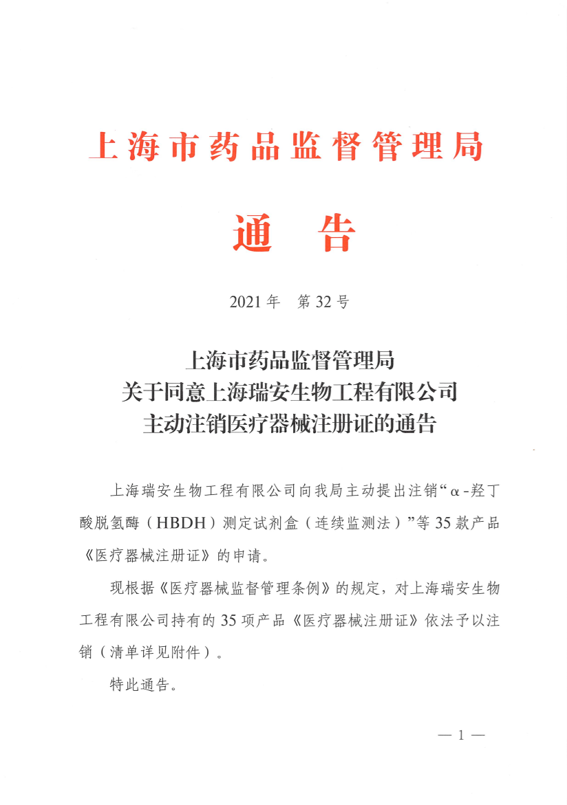 上海瑞安生物工程有限公司向我局主动提出注销“α-羟丁酸脱氢酶(HBDH)测定试剂盒(连续监测法)”等35款产品《医疗器械注册证》的申请。
