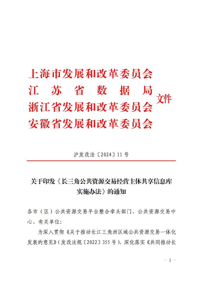 为深入贯彻《关于推动长江三角洲区域公共资源交易一体化发展的意见》(发改法规〔2022〕355号),深化落实《共同推动长江三角洲区域公共资源交易一体化发展合作协议》,推进长三角区域经营主体信息共享互认,上海、江苏、浙江、安徽三省一市公共资源交易平台整合工作牵头部门共同制定了《长三角公共资源交易经营主体共享信息库实施办法》,现印发给你们,请认真贯彻落实。