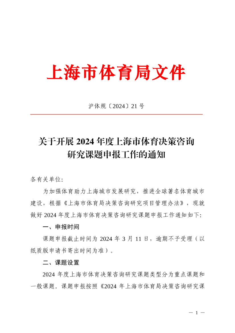 为加强体育助力上海城市发展研究,推进全球著名体育城市建设,根据《上海市体育局决策咨询研究项目管理办法》,现就做好2024年度上海市体育决策咨询研究课题申报工作通知如下:
