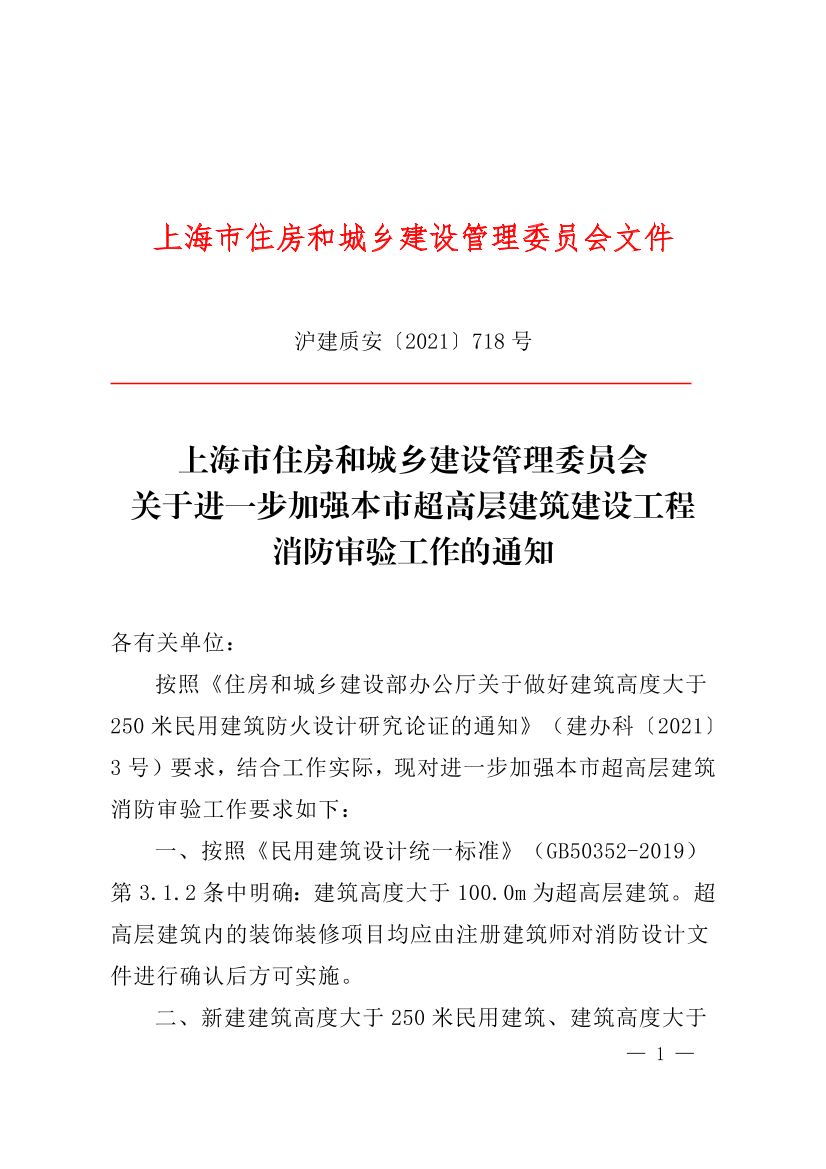 按照《住房和城乡建设部办公厅关于做好建筑高度大于250米民用建筑防火设计研究论证的通知》(建办科〔2021〕3号)要求,结合工作实际,现对进一步加强本市超高层建筑消防审验工作要求如下: