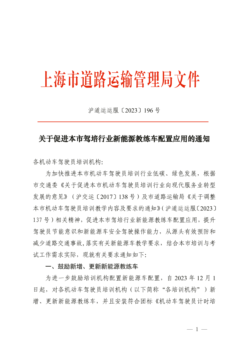 为加快推进本市机动车驾驶员培训行业低碳、绿色发展,根据市交通委《关于促进本市机动车驾驶员培训行业向现代服务业转型发展的意见》(沪交运〔2017〕138号)及市道路运输局《关于调整本市机动车驾驶员培训教学内容及要求的通知》(沪道运运服〔2023〕137号)相关精神,促进本市驾培行业新能源教练车配置应用,提升驾驶员节能意识和新能源车安全驾驶操作能力,从源头有效预防和减少道路交通事故,落实有关新能源车教学要求,结合本市培训与考试工作需求实际,现就有关要求通知如下: