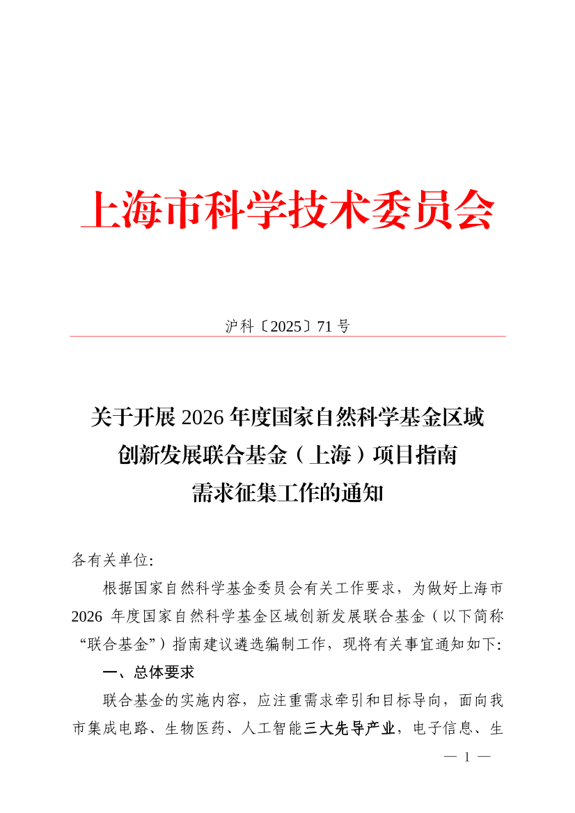 根据国家自然科学基金委员会有关工作要求,为做好上海市2026年度国家自然科学基金区域创新发展联合基金(以下简称“联合基金”)指南建议遴选编制工作,现将有关事宜通知如下:
