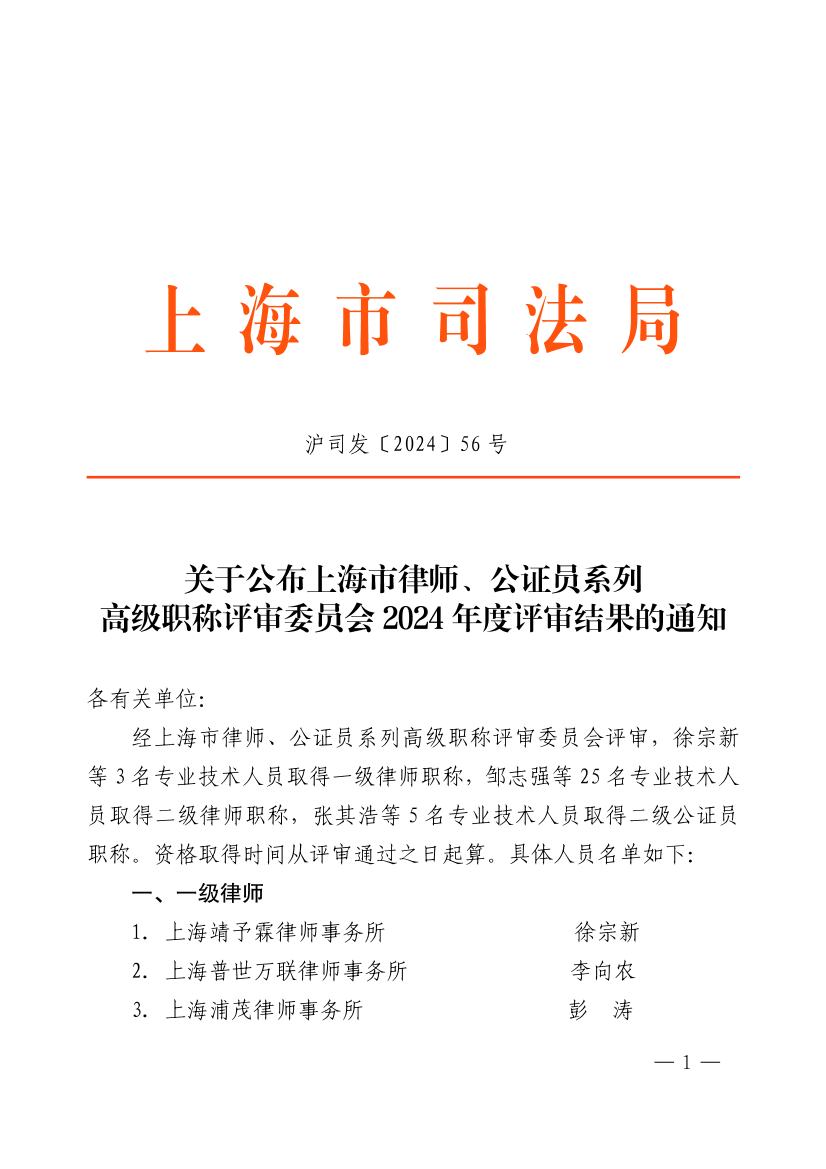 经上海市律师、公证员系列高级职称评审委员会评审,徐宗新等3名专业技术人员取得一级律师职称,邹志强等25名专业技术人员取得二级律师职称,张其浩等5名专业技术人员取得二级公证员职称。资格取得时间从评审通过之日起算。具体人员名单如下: