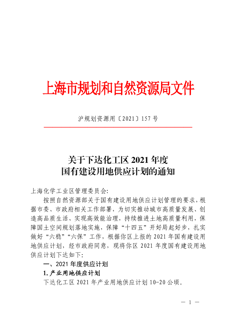 关于下达化工区2021年度国有建设用地供应计划的通知