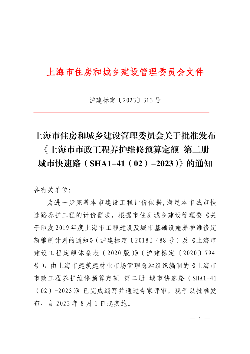 关于批准发布《上海市市政工程养护维修预算定额 第二册 城市快速路(SHA1-41(02)-2023)》的通知