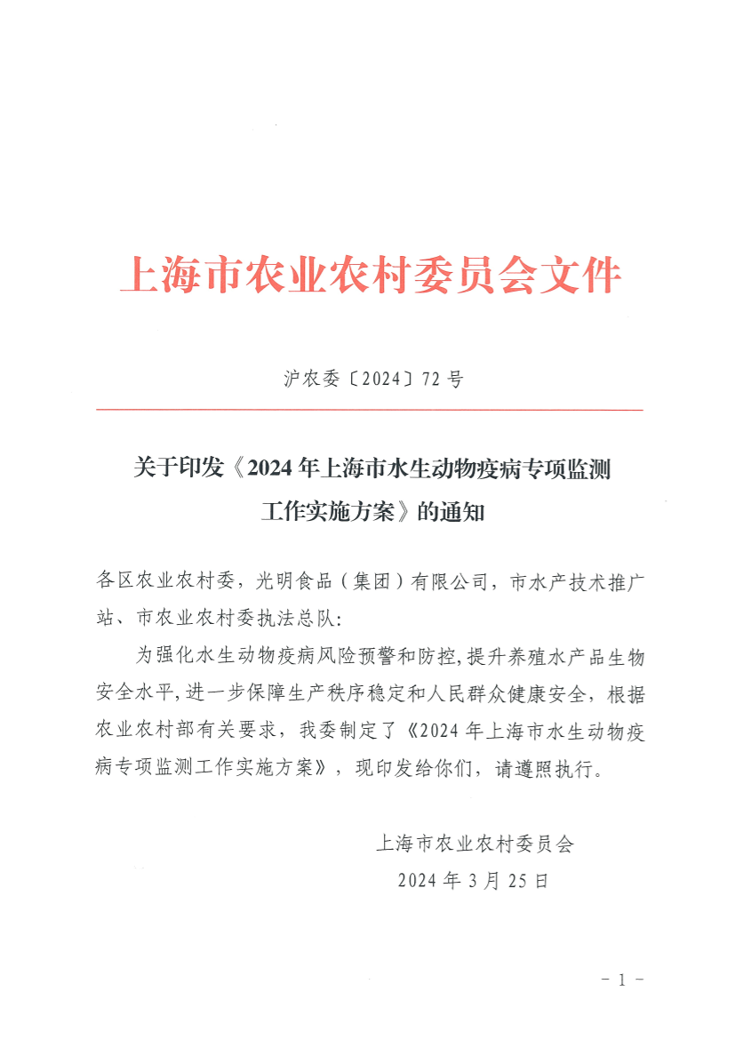 为强化水生动物疫病风险预警和防控,提升养殖水产品生物安全水平,进一步保障生产秩序稳定和人民群众健康安全,根据农业农村部有关要求,我委制定了《2024年上海市水生动物疫病专项监测工作实施方案》,现印发给你们,请遵照执行。