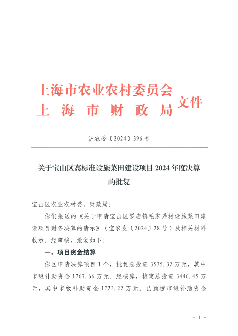 你们报送的《关于申请宝山区罗店镇毛家弄村设施菜田建设项目财务决算的请示》(宝农发〔2024〕28号)及相关材料收悉。经审核,批复如下: