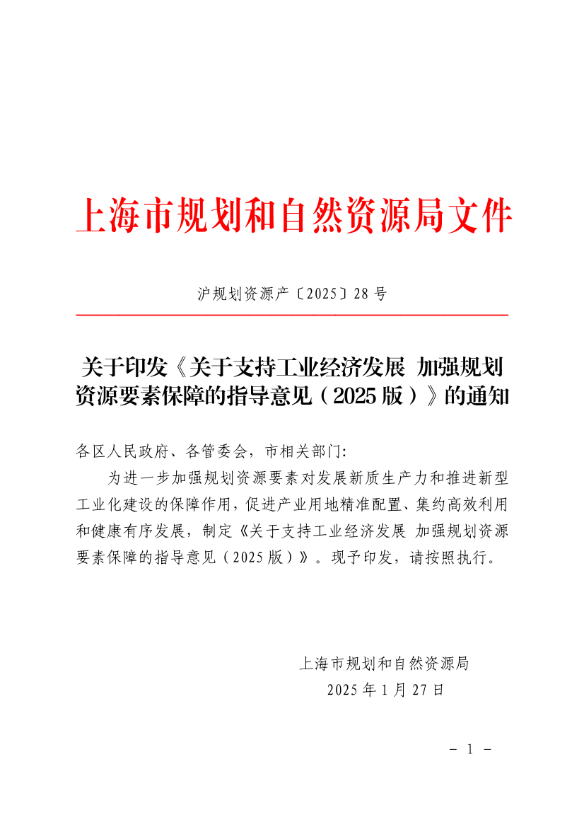为进一步加强规划资源要素对发展新质生产力和推进新型工业化建设的保障作用,促进产业用地精准配置、集约高效利用和健康有序发展,制定《关于支持工业经济发展 加强规划资源要素保障的指导意见(2025版)》。现予印发,请按照执行。