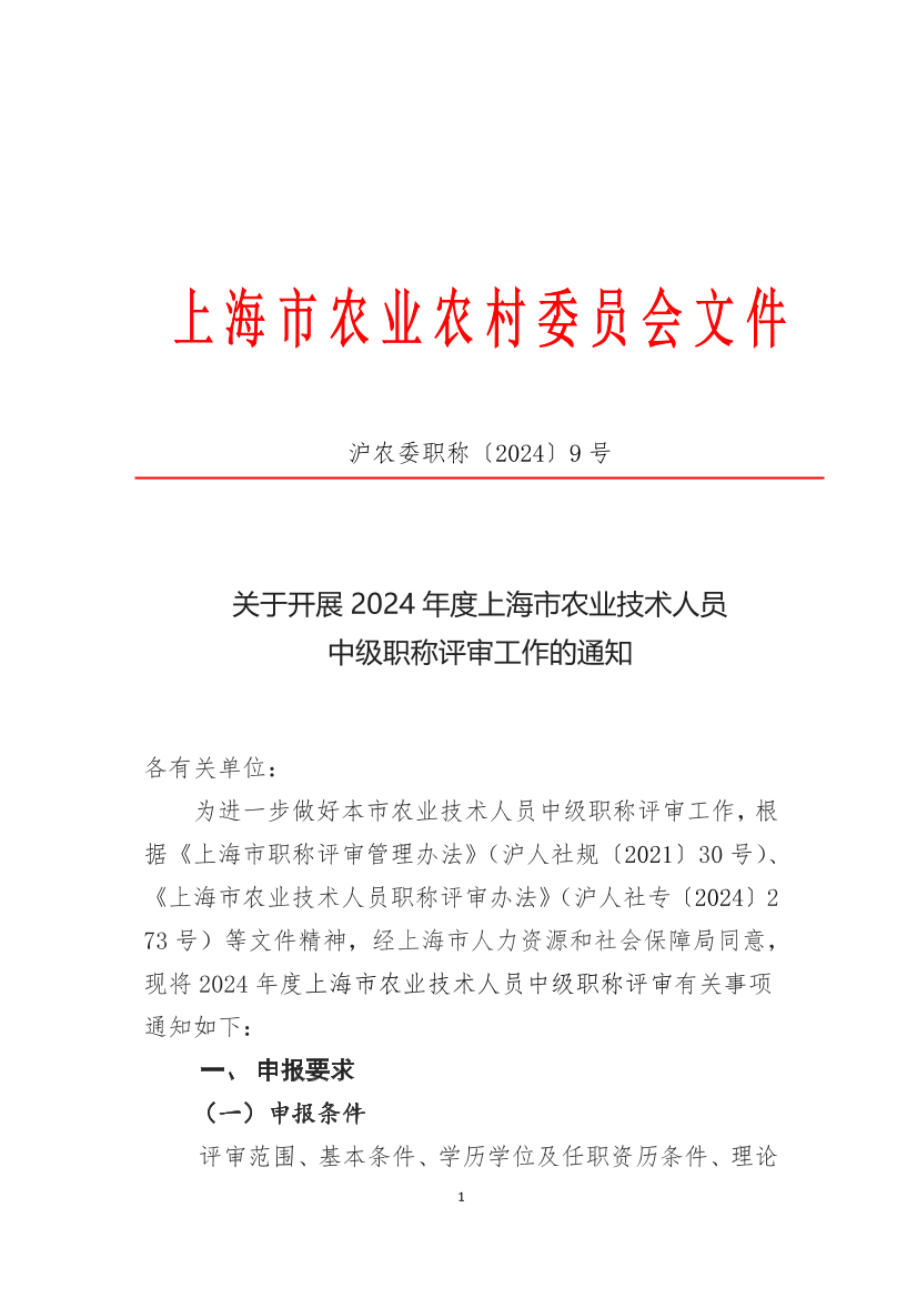 为进一步做好本市农业技术人员中级职称评审工作,根据《上海市职称评审管理办法》(沪人社规〔2021〕30号)、《上海市农业技术人员职称评审办法》(沪人社专〔2024〕273号)等文件精神,经上海市人力资源和社会保障局同意,现将2024年度上海市农业技术人员中级职称评审有关事项通知如下: