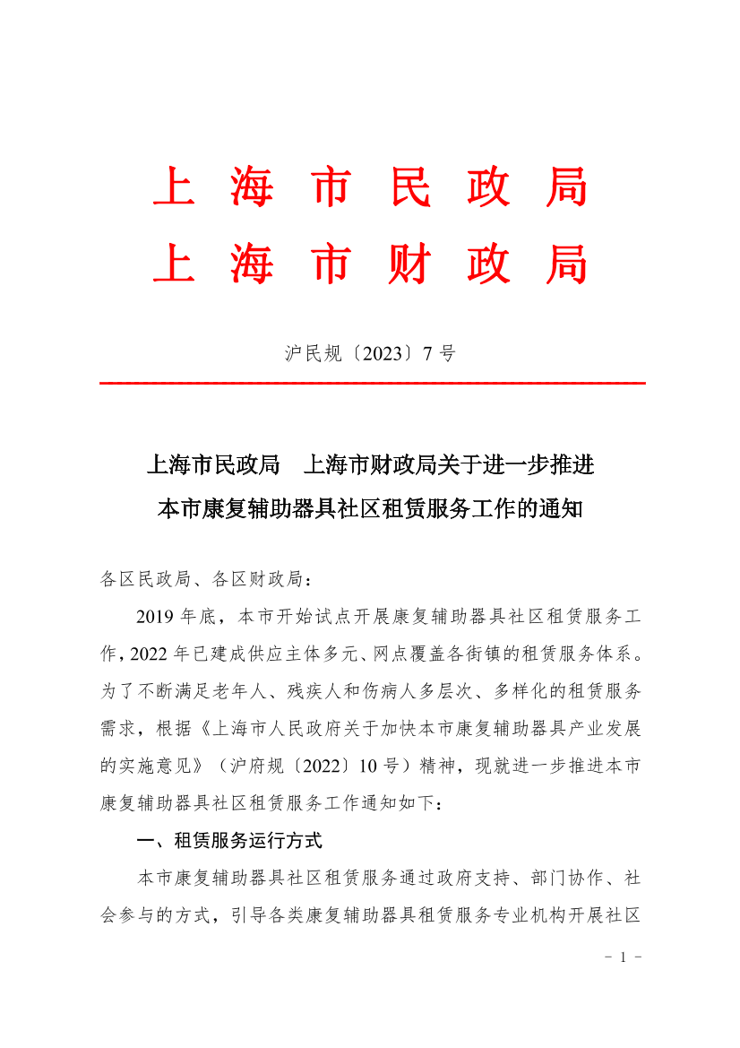 2019年底,本市开始试点开展康复辅助器具社区租赁服务工作,2022年已建成供应主体多元、网点覆盖各街镇的租赁服务体系。为了不断满足老年人、残疾人和伤病人多层次、多样化的租赁服务需求,根据《上海市人民政府关于加快本市康复辅助器具产业发展的实施意见》(沪府规〔2022〕10号)精神,现就进一步推进本市康复辅助器具社区租赁服务工作通知如下: