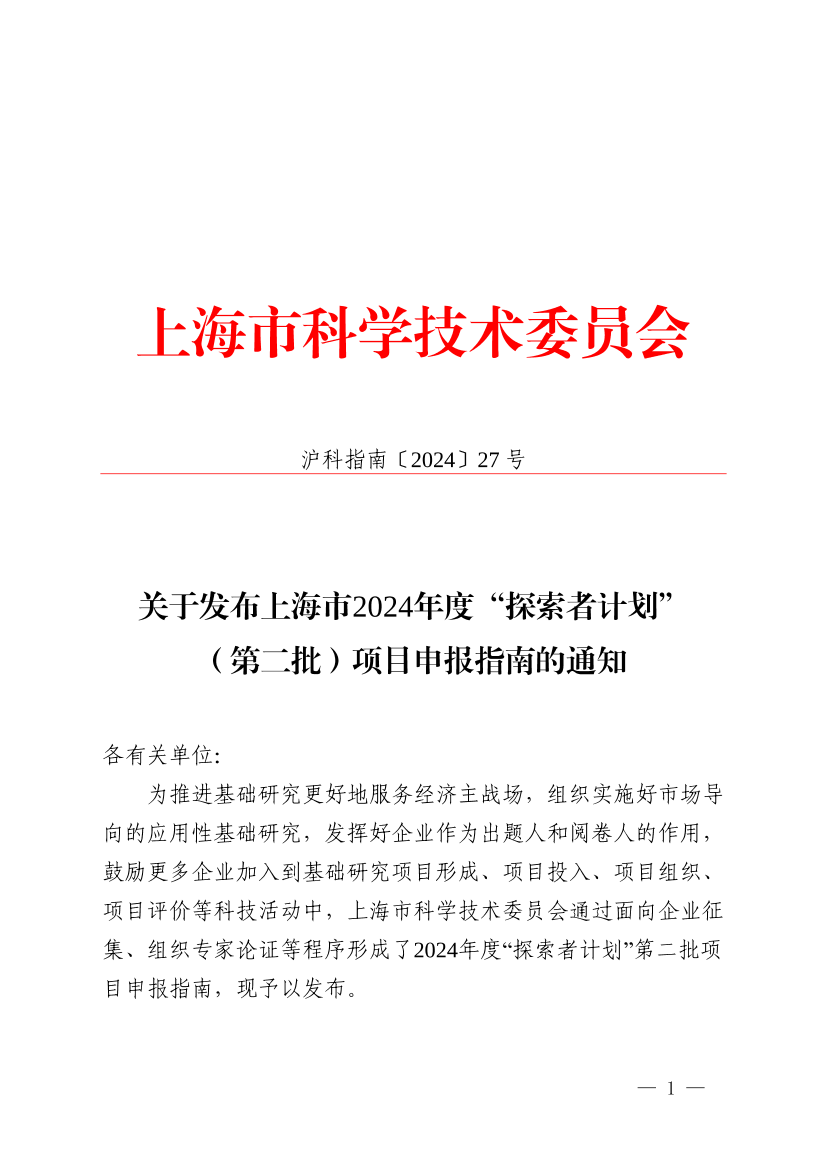 为推进基础研究更好地服务经济主战场,组织实施好市场导向的应用性基础研究,发挥好企业作为出题人和阅卷人的作用,鼓励更多企业加入到基础研究项目形成、项目投入、项目组织、项目评价等科技活动中,上海市科学技术委员会通过面向企业征集、组织专家论证等程序形成了2024年度“探索者计划”第二批项目申报指南,现予以发布。
