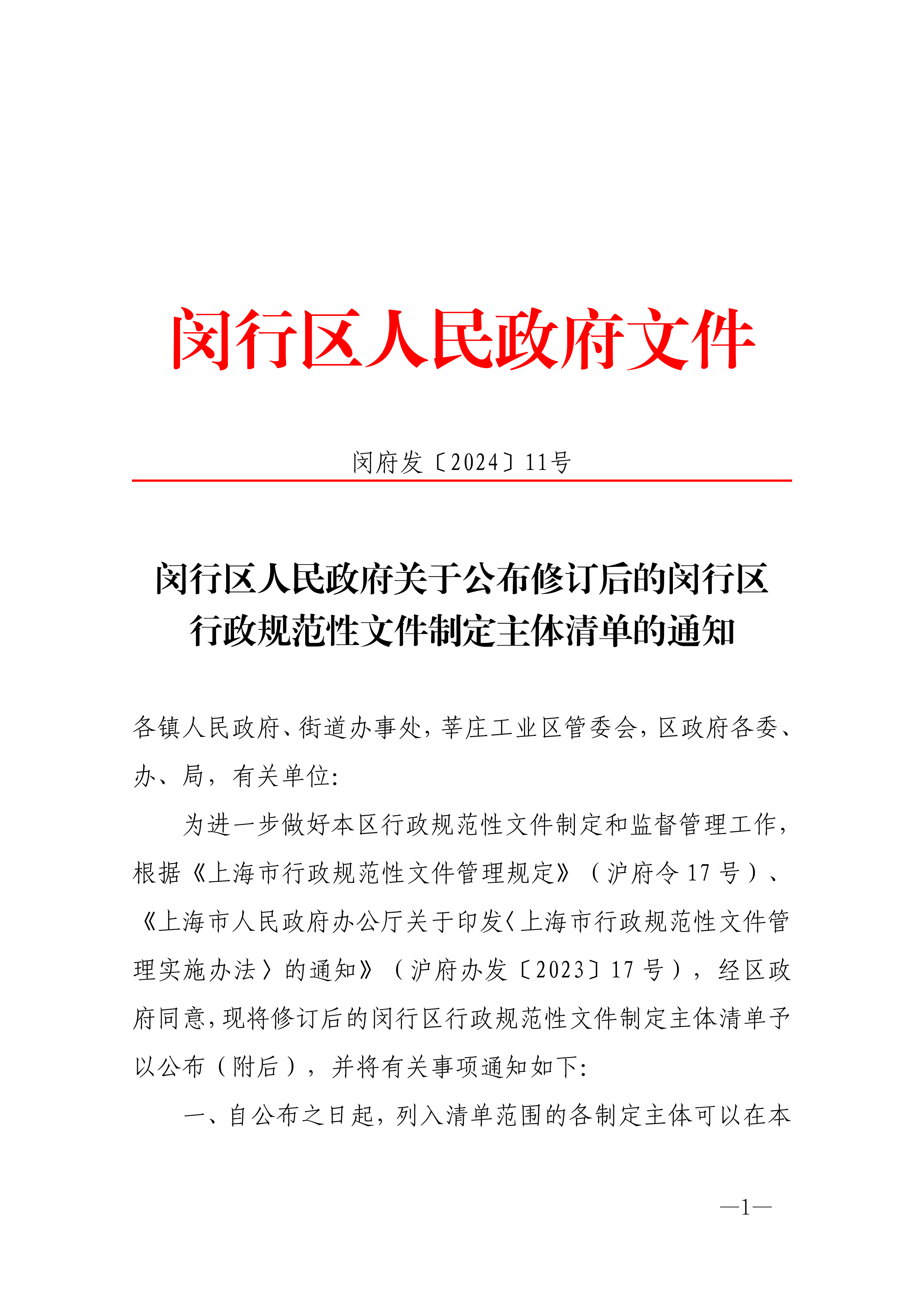 为进一步做好本区行政规范性文件制定和监督管理工作,根据《上海市行政规范性文件管理规定》(沪府令17号)、《上海市人民政府办公厅关于印发〈上海市行政规范性文件管理实施办法〉的通知》(沪府办发〔2023〕17号),经区政府同意,现将修订后的闵行区行政规范性文件制定主体清单予以公布(附后),并将有关事项通知如下: