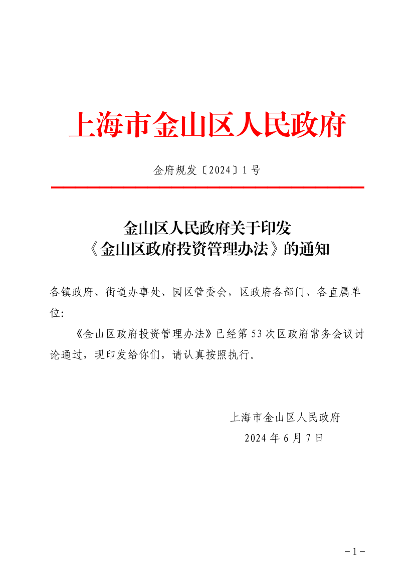 《金山区政府投资管理办法》已经第53次区政府常务会议讨论通过,现印发给你们,请认真按照执行。