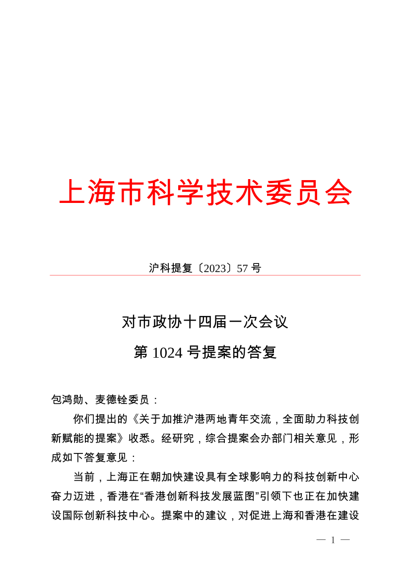 你们提出的《关于加推沪港两地青年交流,全面助力科技创新赋能的提案》收悉。经研究,综合提案会办部门相关意见,形成如下答复意见: