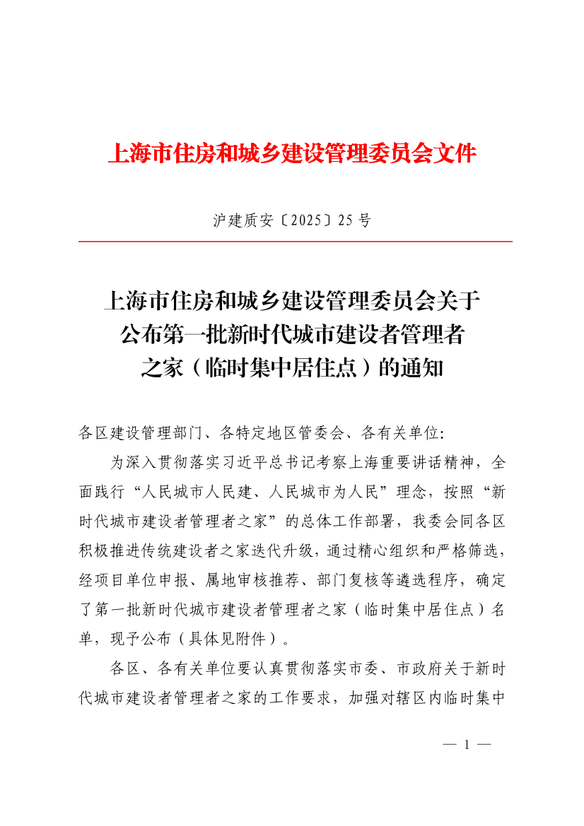 为深入贯彻落实习近平总书记考察上海重要讲话精神,全面践行“人民城市人民建、人民城市为人民”理念,按照“新时代城市建设者管理者之家”的总体工作部署,我委会同各区积极推进传统建设者之家迭代升级,通过精心组织和严格筛选,经项目单位申报、属地审核推荐、部门复核等遴选程序,确定了第一批新时代城市建设者管理者之家(临时集中居住点)名单,现予公布(具体见附件)。