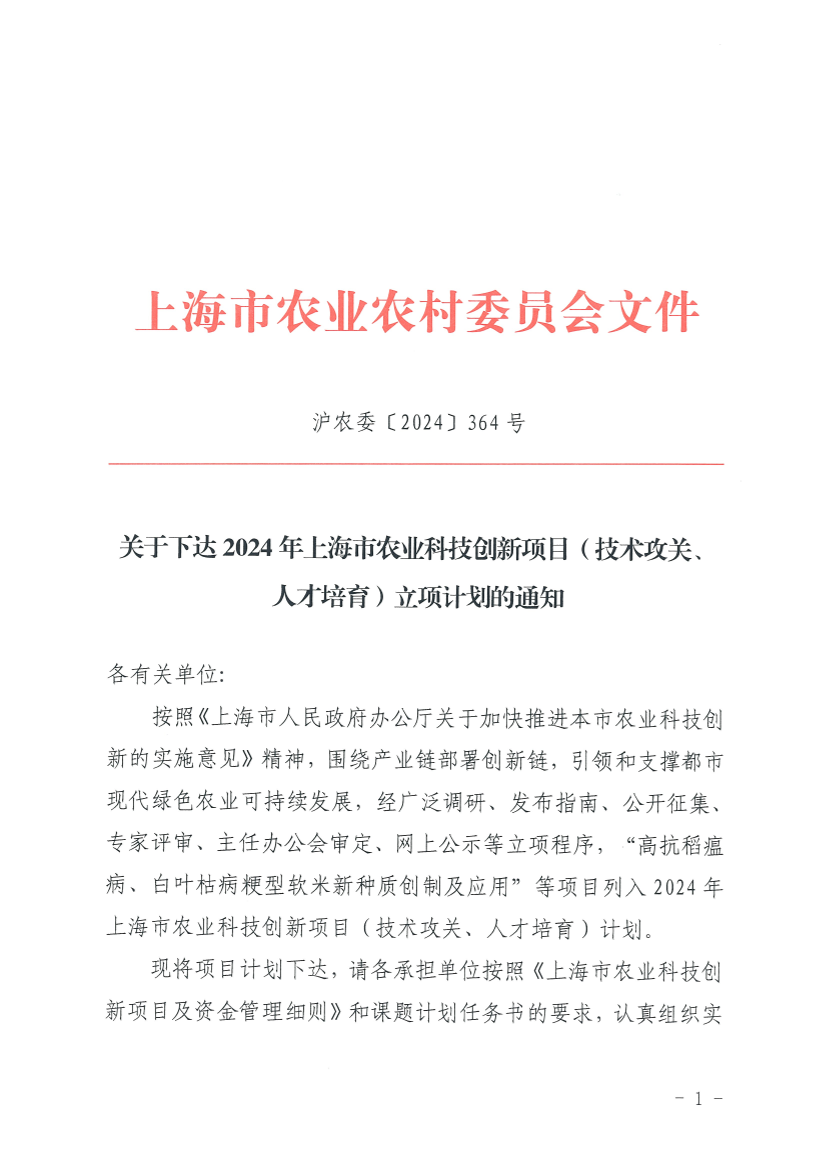 按照《上海市人民政府办公厅关于加快推进本市农业科技创新的实施意见》精神,围绕产业链部署创新链,引领和支撑都市现代绿色农业可持续发展,经广泛调研、发布指南、公开征集、专家评审、主任办公会审定、网上公示等立项程序,“高抗稻瘟病、白叶枯病粳型软米新种质创制及应用”等项目列入2024年上海市农业科技创新项目(技术攻关、人才培育)计划。