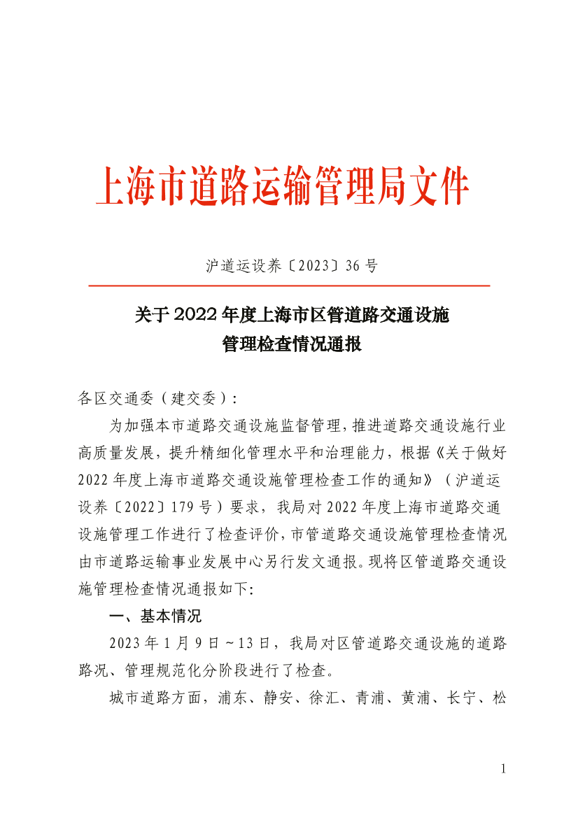 为加强本市道路交通设施监督管理,推进道路交通设施行业高质量发展,提升精细化管理水平和治理能力,根据《关于做好2022年度上海市道路交通设施管理检查工作的通知》(沪道运设养〔2022〕179号)要求,我局对2022年度上海市道路交通设施管理工作进行了检查评价,市管道路交通设施管理检查情况由市道路运输事业发展中心另行发文通报。现将区管道路交通设施管理检查情况通报如下: