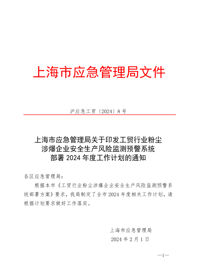 根据本市《工贸行业粉尘涉爆企业安全生产风险监测预警系统部署方案》要求,我局制定了全市2024年度相关工作计划,请根据计划要求做好工作落实。