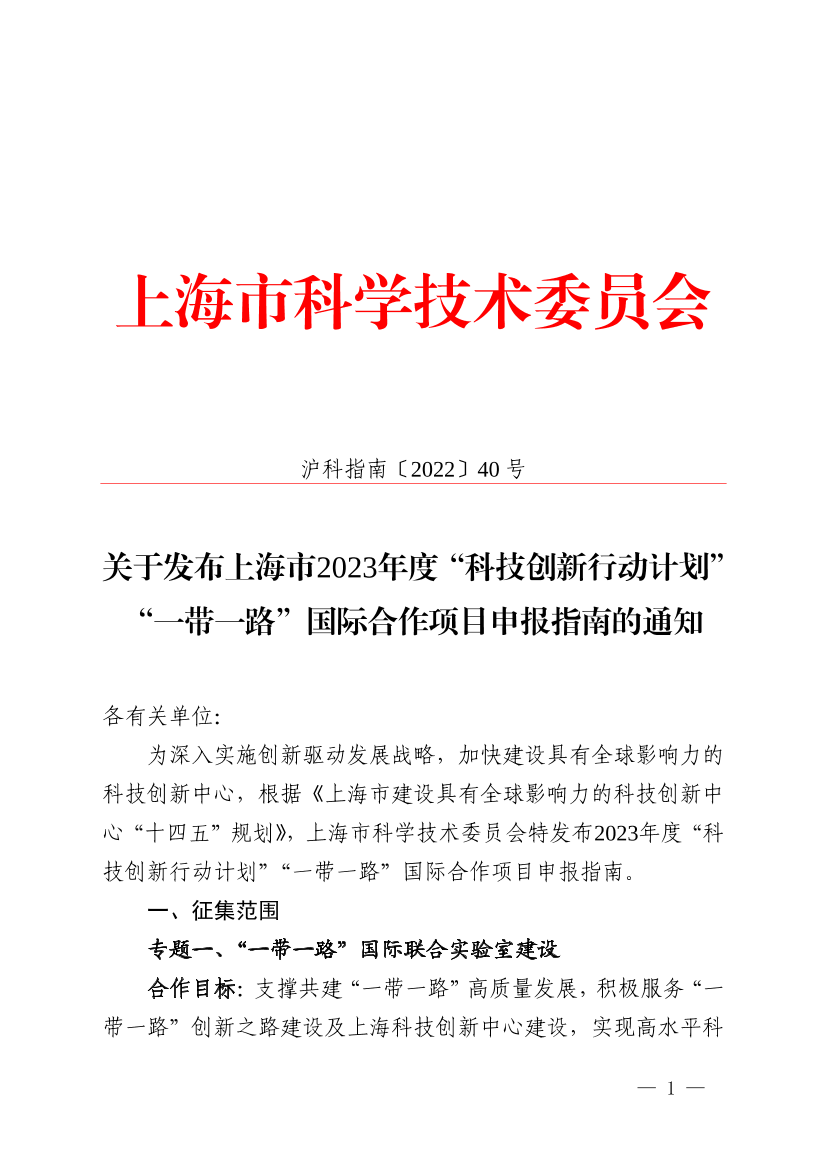 为深入实施创新驱动发展战略,加快建设具有全球影响力的科技创新中心,根据《上海市建设具有全球影响力的科技创新中心“十四五”规划》,上海市科学技术委员会特发布2023年度“科技创新行动计划”“一带一路”国际合作项目申报指南。