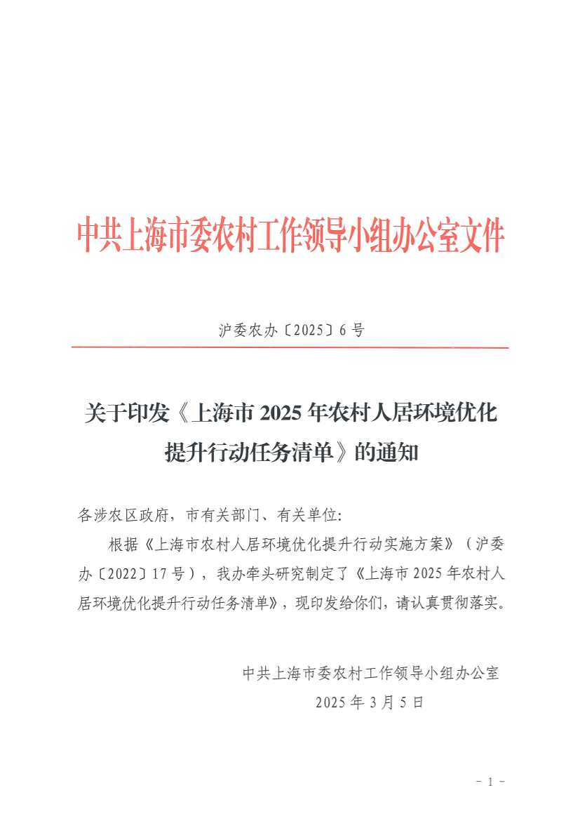 根据《上海市农村人居环境优化提升行动实施方案》(沪委办〔2022〕17号),我办牵头研究制定了《上海市2025年农村人居环境优化提升行动任务清单》,现印发给你们,请认真贯彻落实。
