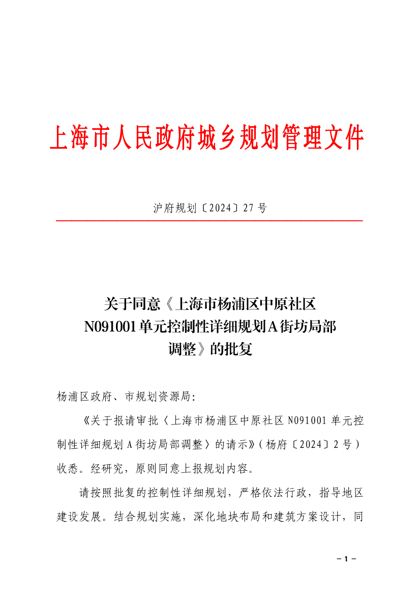 《关于报请审批〈上海市杨浦区中原社区N091001单元控制性详细规划A街坊局部调整〉的请示》(杨府〔2024〕2号)收悉。经研究,原则同意上报规划内容。