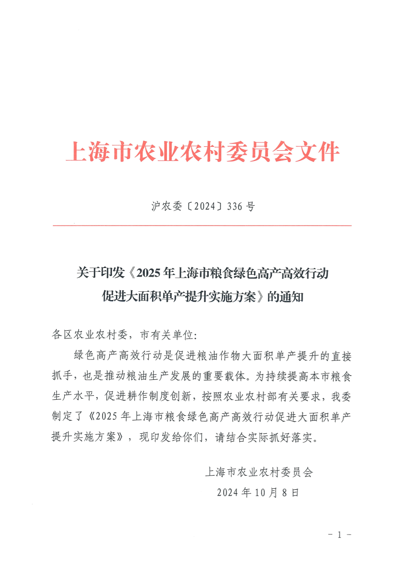 绿色高产高效行动是促进粮油作物大面积单产提升的直接抓手,也是推动粮油生产发展的重要载体。为持续提高本市粮食生产水平,促进耕作制度创新,按照农业农村部有关要求,我委制定了《2025年上海市粮食绿色高产高效行动促进大面积单产提升实施方案》,现印发给你们,请结合实际抓好落实。