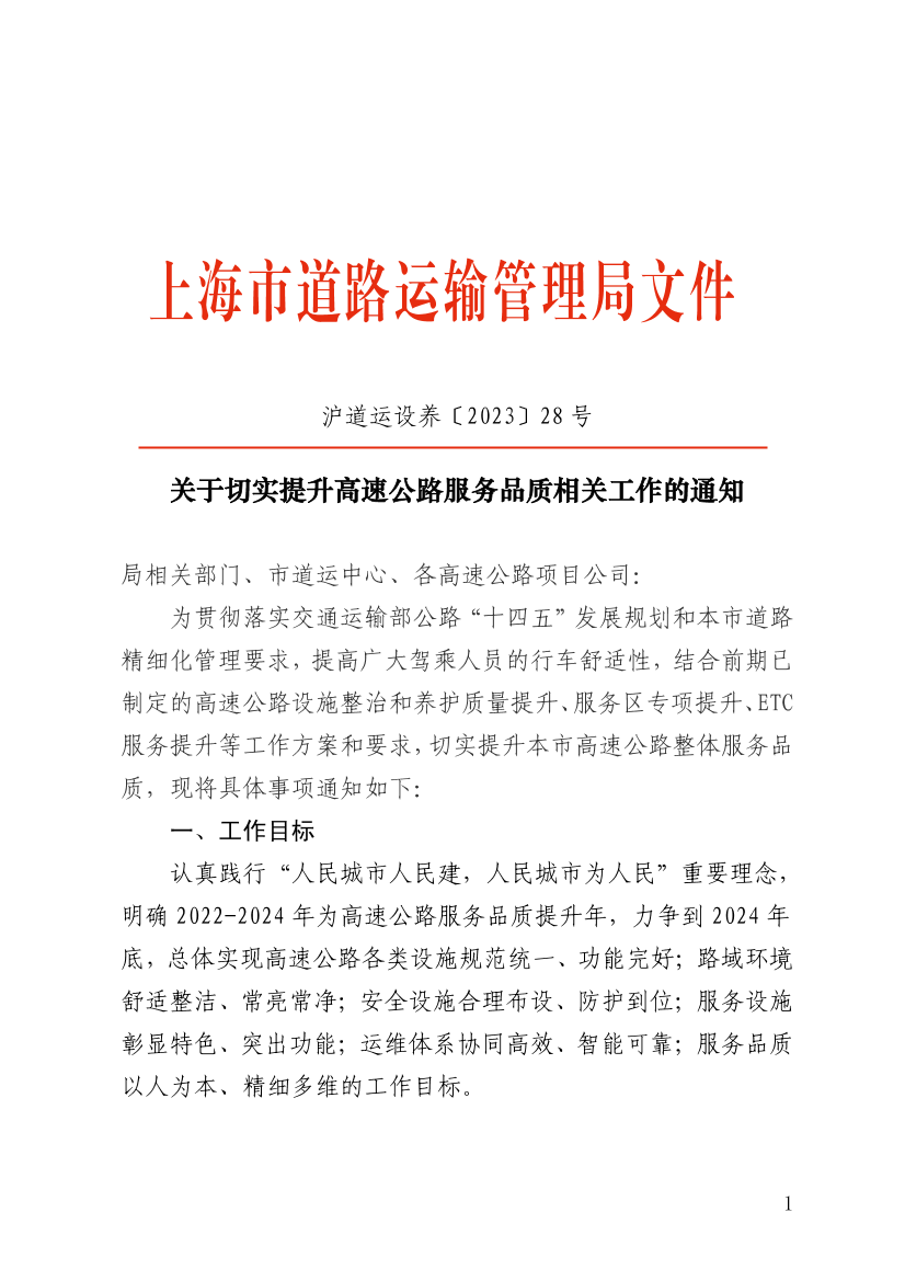 为贯彻落实交通运输部公路“十四五”发展规划和本市道路精细化管理要求,提高广大驾乘人员的行车舒适性,结合前期已制定的高速公路设施整治和养护质量提升、服务区专项提升、ETC服务提升等工作方案和要求,切实提升本市高速公路整体服务品质,现将具体事项通知如下: