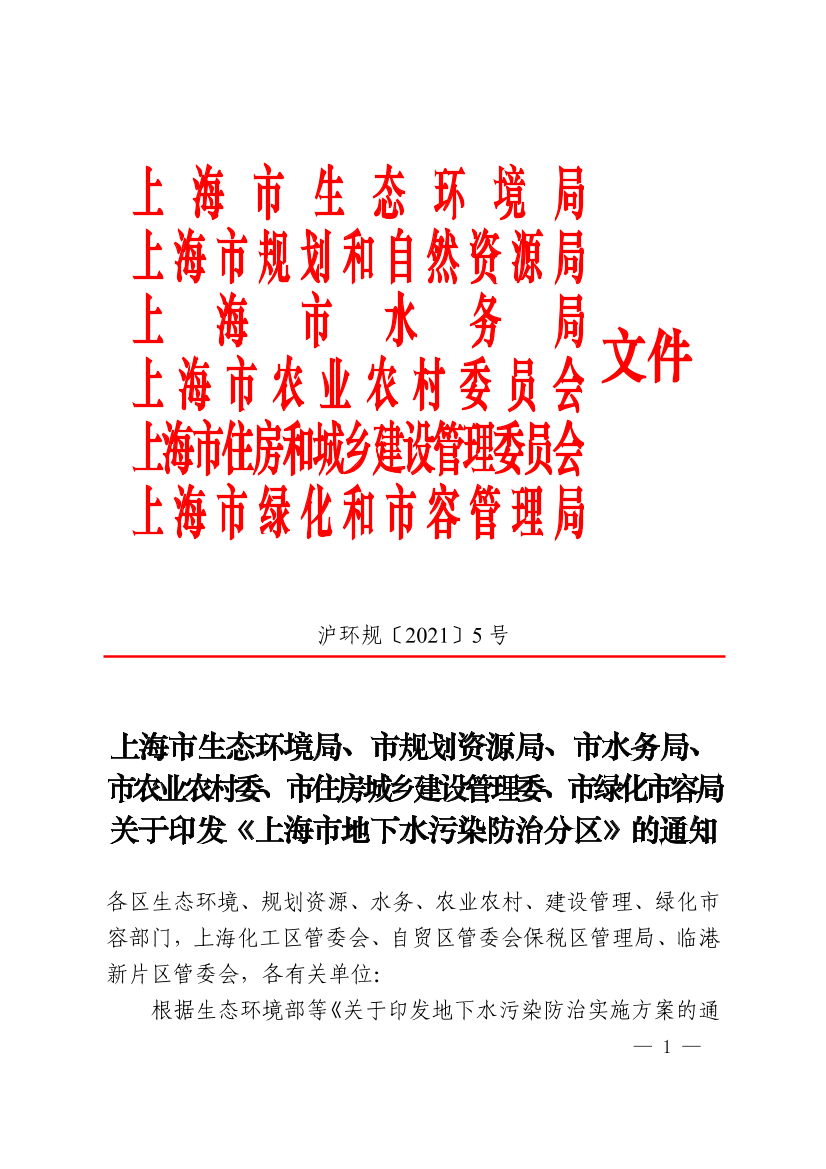 根据生态环境部等《关于印发地下水污染防治实施方案的通知》(环土壤〔2019〕25号)、上海市生态环境局等《关于印发〈上海市地下水污染防治实施方案〉的通知》(沪环土〔2019〕250号)、《地下水污染防治分区划分工作指南》等有关要求,上海市生态环境局联合市规划资源局、市水务局、市农业农村委、市住房城乡建设管理委、市绿化市容局等共同制定了《上海市地下水污染防治分区》,并经市生态环境局局长办公会议审议通过,现予印发,请遵照执行。