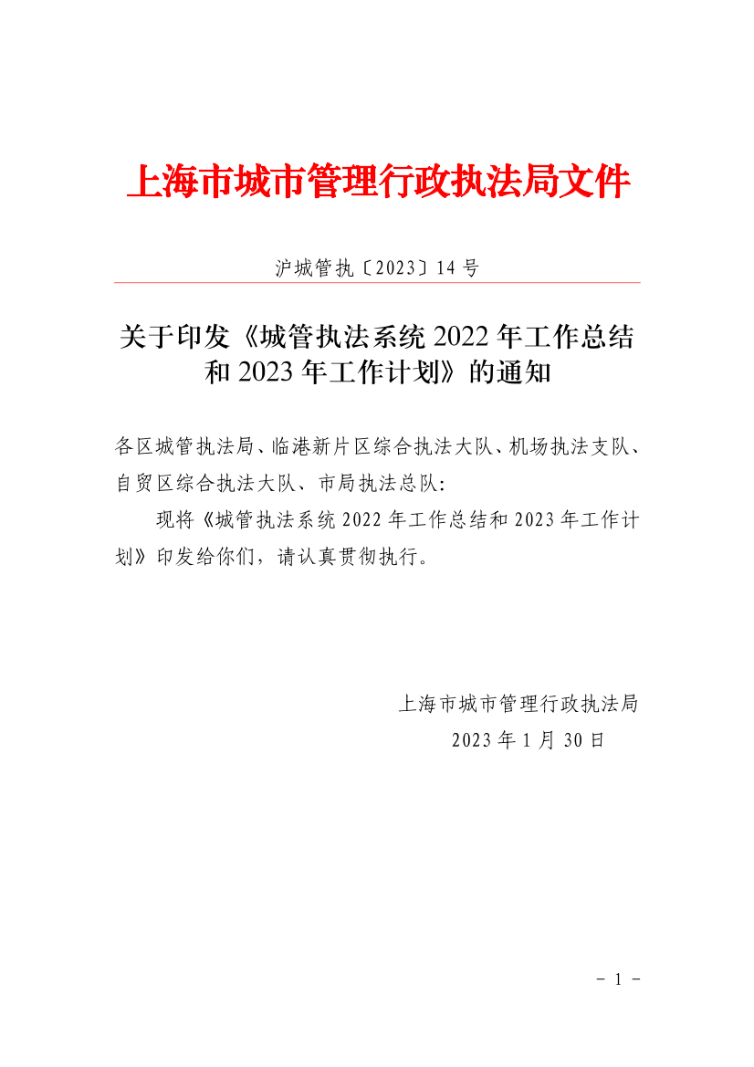 上海市城市管理行政执法局办公室 2023年1月30日印发