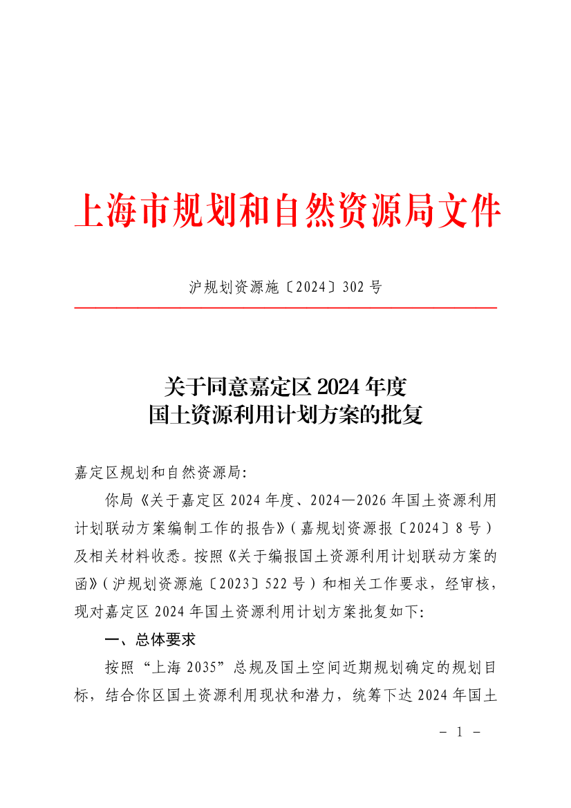 关于同意嘉定区2024年度国土资源利用计划方案的批复