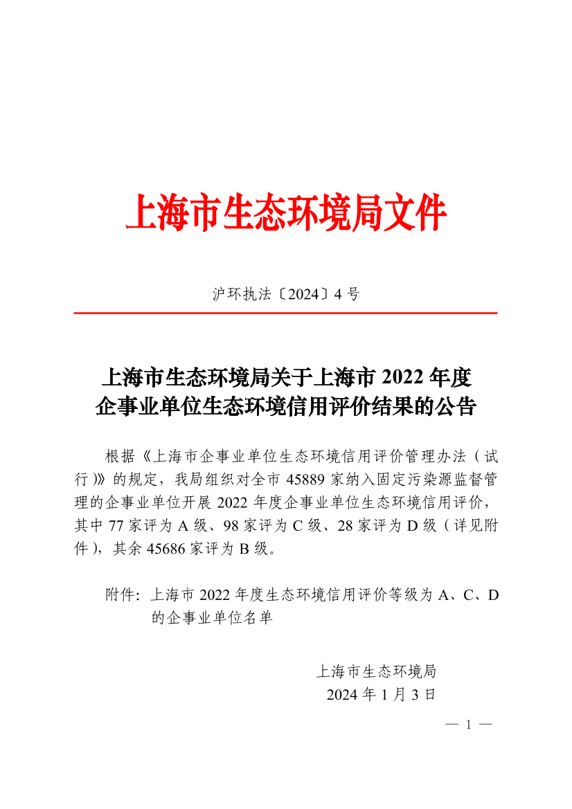 根据《上海市企事业单位生态环境信用评价管理办法(试行)》的规定,我局组织对全市45889家纳入固定污染源监督管理的企事业单位开展2022年度企事业单位生态环境信用评价,其中77家评为A级、98家评为C级、28家评为D级(详见附件),其余45686家评为B级。