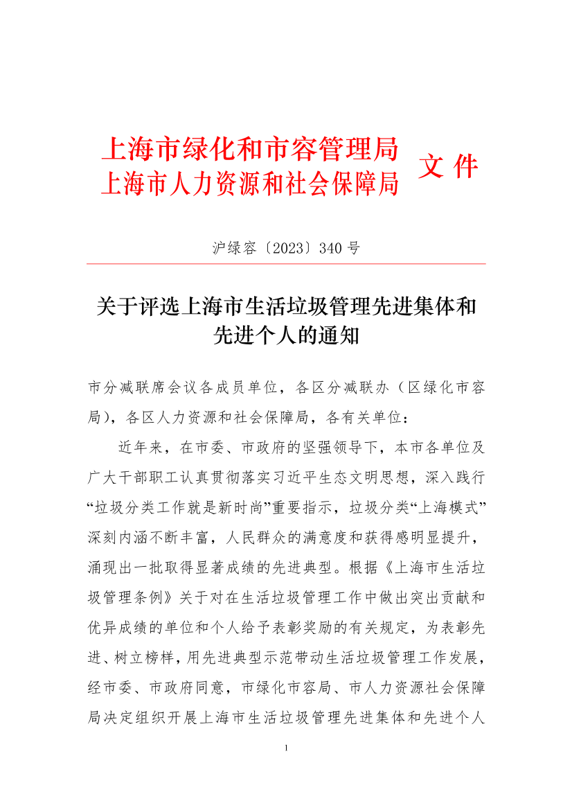 近年来,在市委、市政府的坚强领导下,本市各单位及广大干部职工认真贯彻落实习近平生态文明思想,深入践行“垃圾分类工作就是新时尚”重要指示,垃圾分类“上海模式”深刻内涵不断丰富,人民群众的满意度和获得感明显提升,涌现出一批取得显著成绩的先进典型。根据《上海市生活垃圾管理条例》关于对在生活垃圾管理工作中做出突出贡献和优异成绩的单位和个人给予表彰奖励的有关规定,为表彰先进、树立榜样,用先进典型示范带动生活垃圾管理工作发展,经市委、市政府同意,市绿化市容局、市人力资源社会保障局决定组织开展上海市生活垃圾管理先进集体和先进个人评选表彰活动。现就有关事项通知如下: