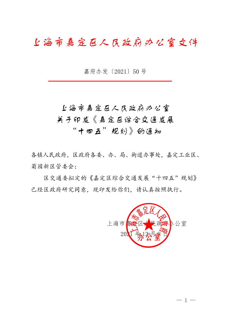 区交通委拟定的《嘉定区综合交通发展“十四五”规划》已经区政府研究同意,现印发给你们,请认真按照执行。
