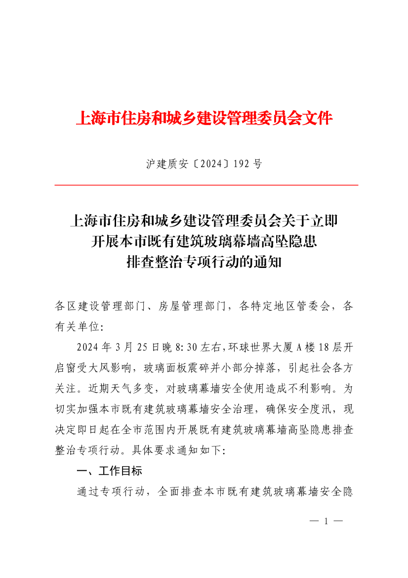 2024年3月25日晚8:30左右,环球世界大厦A楼18层开启窗受大风影响,玻璃面板震碎并小部分掉落,引起社会各方关注。近期天气多变,对玻璃幕墙安全使用造成不利影响。为切实加强本市既有建筑玻璃幕墙安全治理,确保安全度汛,现决定即日起在全市范围内开展既有建筑玻璃幕墙高坠隐患排查整治专项行动。具体要求通知如下: