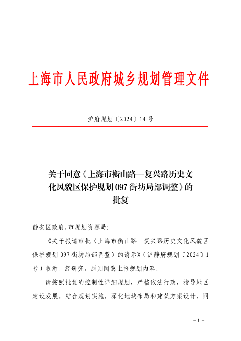 《关于报请审批〈上海市衡山路—复兴路历史文化风貌区保护规划097街坊局部调整〉的请示》(沪静府规划〔2024〕1号)收悉。经研究,原则同意上报规划内容。