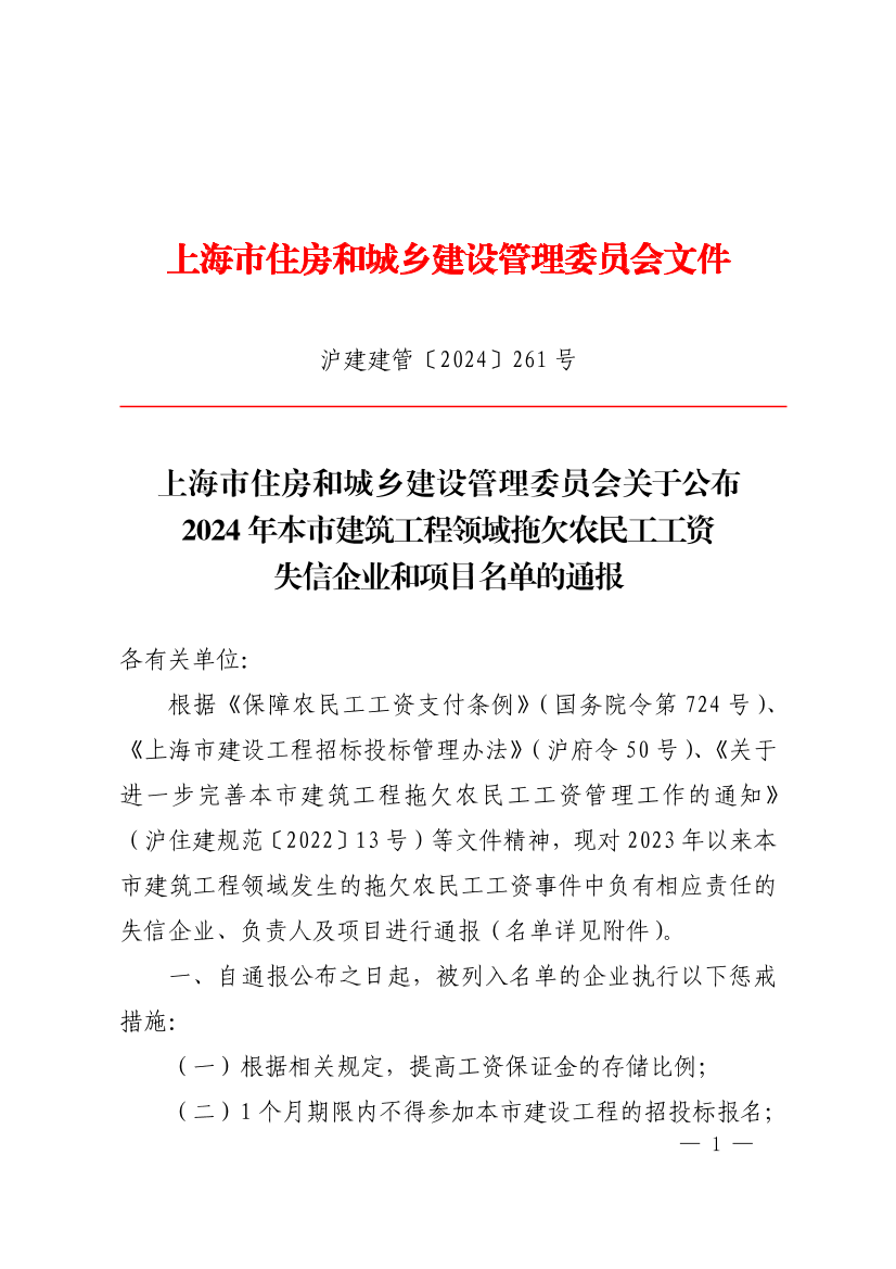 根据《保障农民工工资支付条例》(国务院令第724号)、《上海市建设工程招标投标管理办法》(沪府令50号)、《关于进一步完善本市建筑工程拖欠农民工工资管理工作的通知》(沪住建规范〔2022〕13号)等文件精神,现对2023年以来本市建筑工程领域发生的拖欠农民工工资事件中负有相应责任的失信企业、负责人及项目进行通报(名单详见附件)。