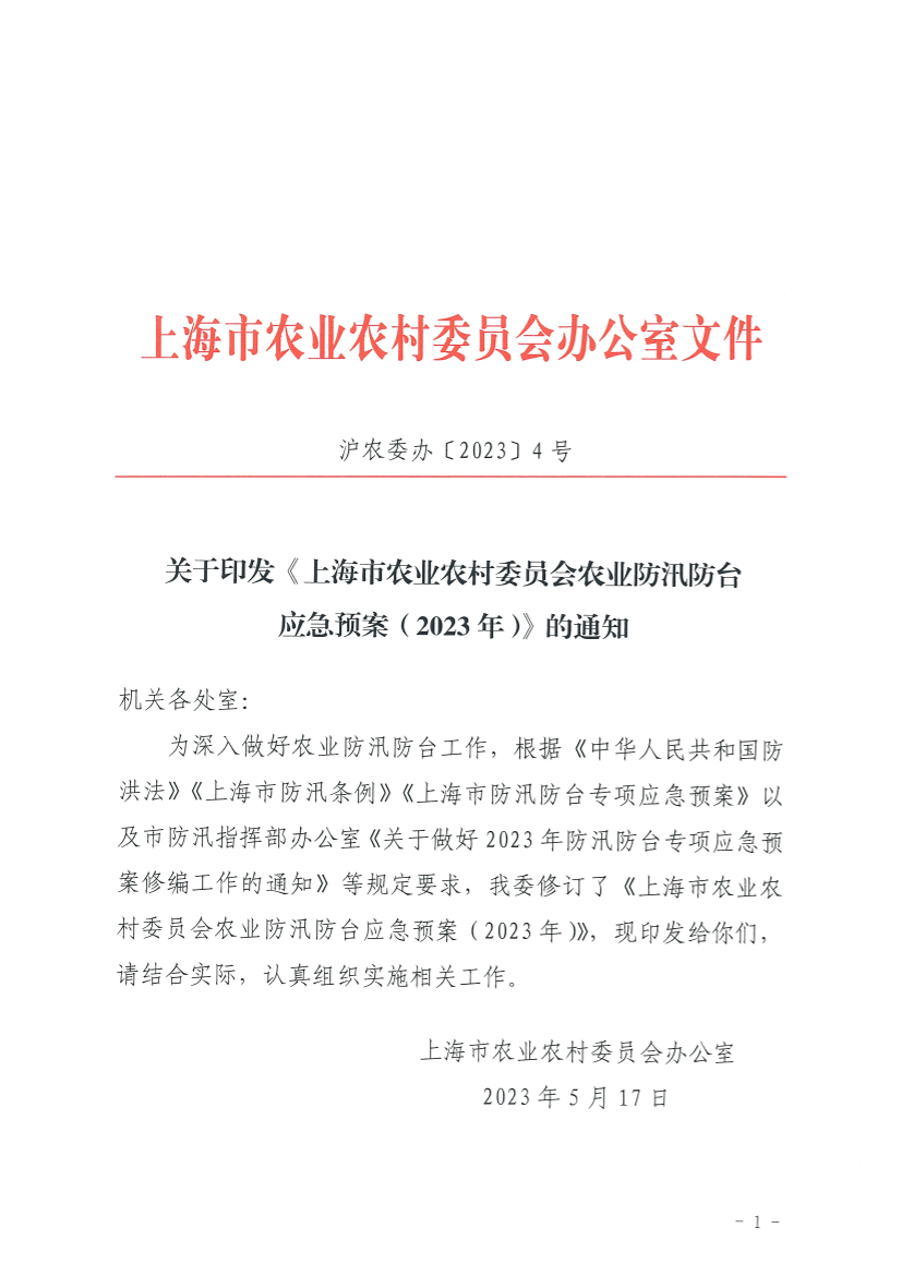 为深入做好农业防汛防台工作,根据《中华人民共和国防洪法》《上海市防汛条例》《上海市防汛防台专项应急预案》以及市防汛指挥部办公室《关于做好2023年防汛防台专项应急预案修编工作的通知》等规定要求,我委修订了《上海市农业农村委员会农业防汛防台应急预案(2023年)》,现印发给你们,请结合实际,认真组织实施相关工作。