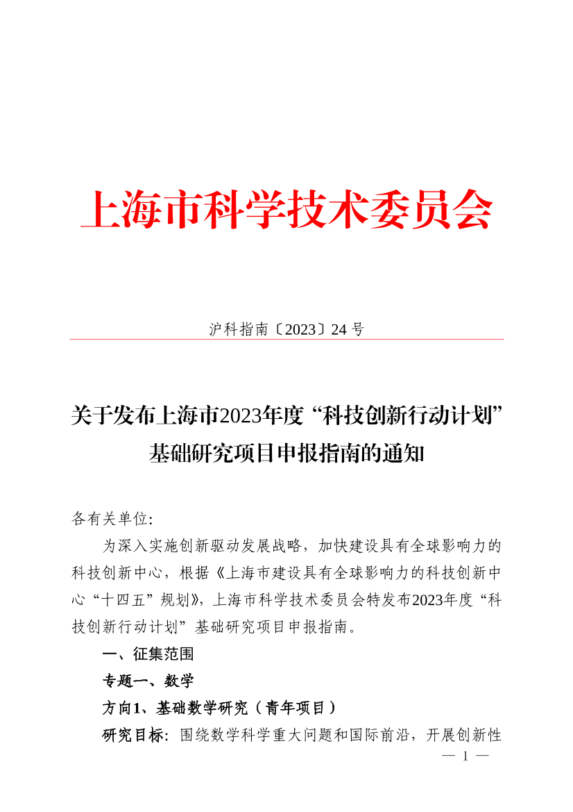 为深入实施创新驱动发展战略,加快建设具有全球影响力的科技创新中心,根据《上海市建设具有全球影响力的科技创新中心“十四五”规划》,上海市科学技术委员会特发布2023年度“科技创新行动计划”基础研究项目申报指南。