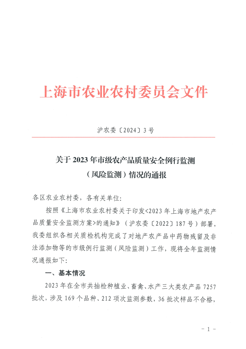 按照《上海市农业农村委关于印发<2023年上海市地产农产品质量安全监测方案>的通知》(沪农委〔2022〕187号)部署,我委组织各相关质检机构完成了对地产农产品中药物残留及非法添加物等的市级例行监测(风险监测)工作,现将全年监测情况通报如下: