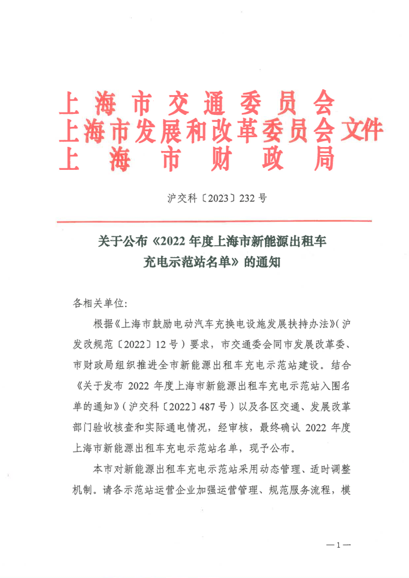 根据《上海市鼓励电动汽车充换电设施发展扶持办法》(沪发改规范〔2022〕12号)要求,市交通委会同市发展改革委、市财政局组织推进全市新能源出租车充电示范站建设。结合《关于发布2022年度上海市新能源出租车充电示范站入围名单的通知》(沪交科〔2022〕487号)以及各区交通、发展改革部门验收核查和实际通电情况,经审核,最终确认2022年度上海市新能源出租车充电示范站名单,现予公布。