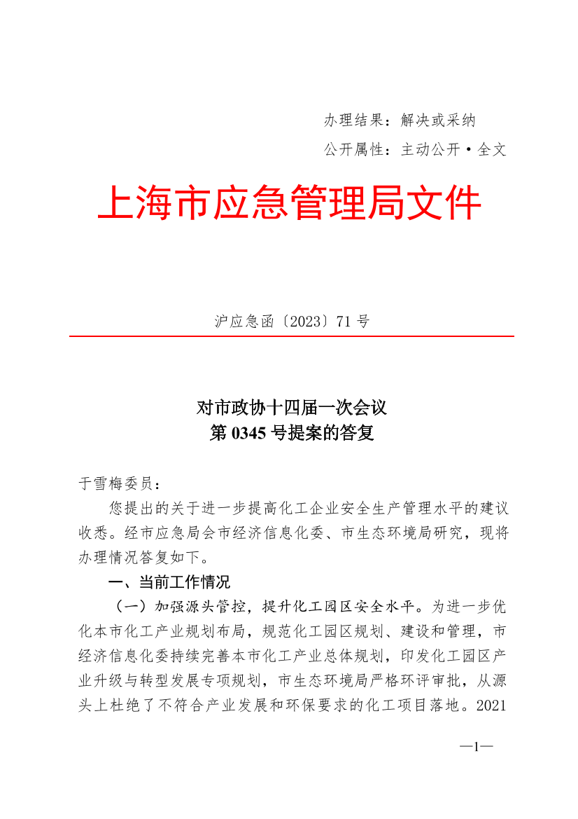您提出的关于进一步提高化工企业安全生产管理水平的建议收悉。经市应急局会市经济信息化委、市生态环境局研究,现将办理情况答复如下。