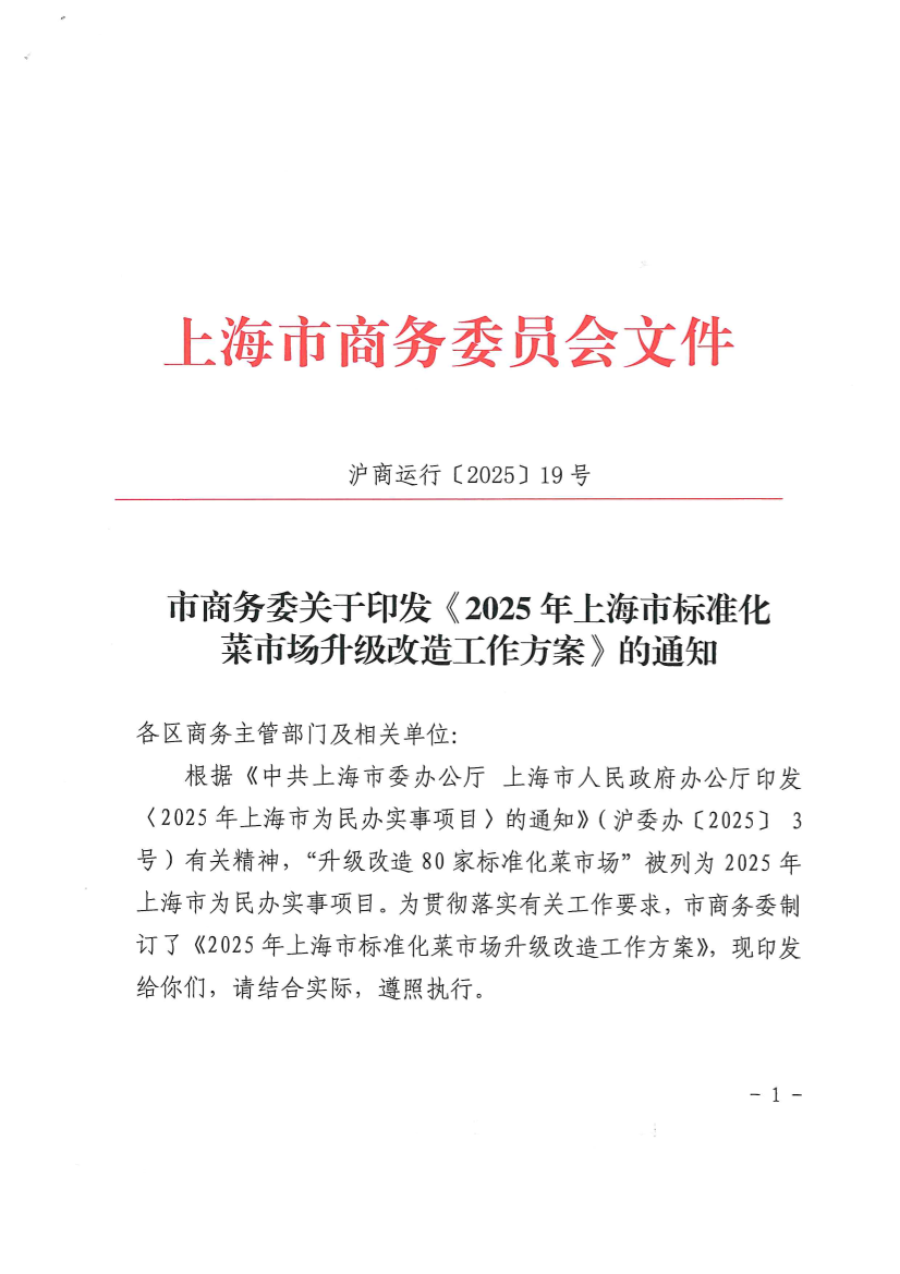 1.市商务委印发《2025年上海市标准化菜市场升级改造工作方案》(以下简称《工作方案》),明确2025年各区标准化菜市场升级改造任务及建设要求,启动实事项目建设。