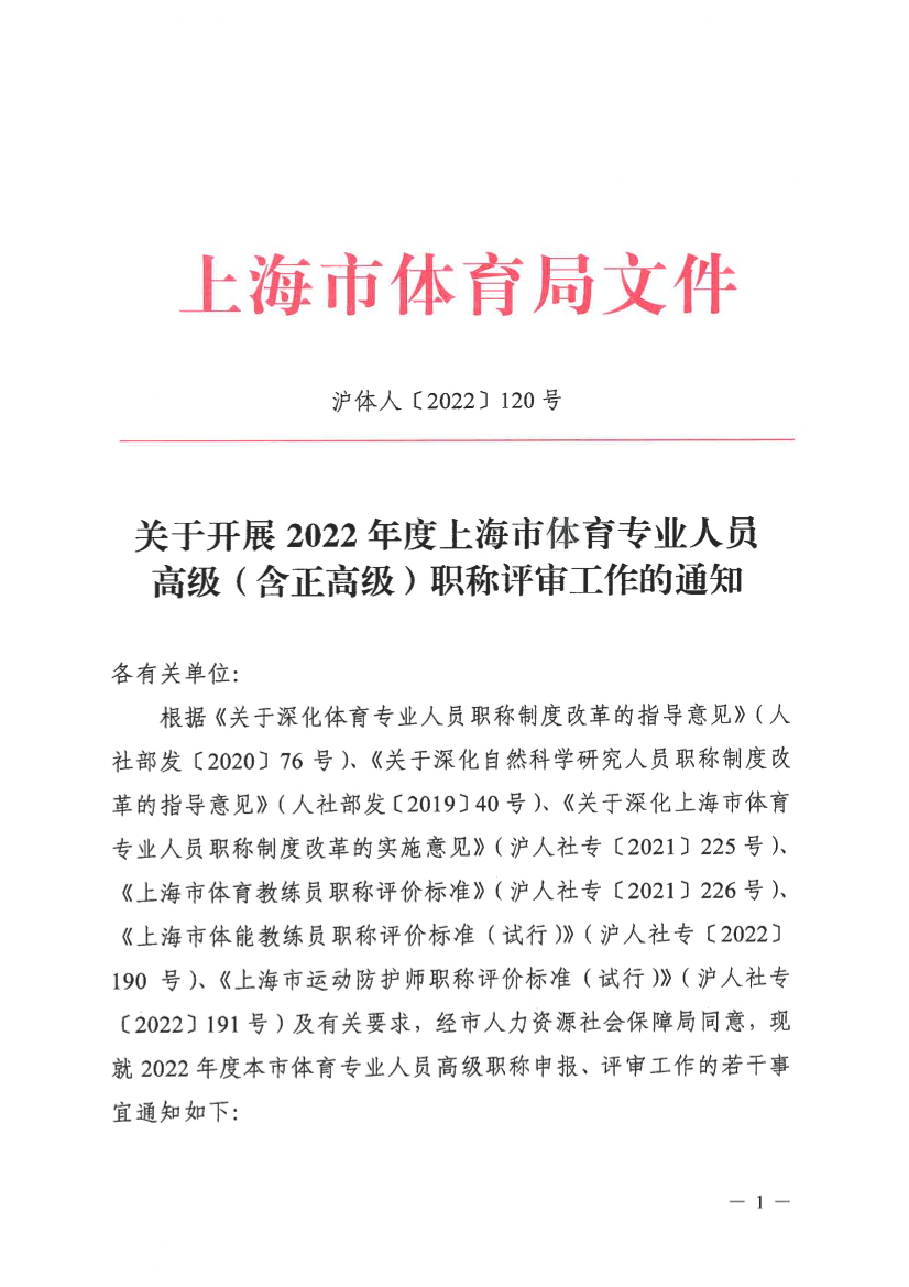 根据《关于深化体育专业人员职称制度改革的指导意见》(人社部发〔2020〕76号)、《关于深化自然科学研究人员职称制度改革的指导意见》(人社部发〔2019〕40号)、《关于深化上海市体育专业人员职称制度改革的实施意见》(沪人社专〔2021〕225号)、《上海市体育教练员职称评价标准》(沪人社专〔2021〕226号)、《上海市体能教练员职称评价标准(试行)》(沪人社专〔2022〕190号)、《上海市运动防护师职称评价标准(试行)》(沪人社专〔2022〕191号)及有关要求,经市人力资源社会保障局同意,现就2022年度本市体育专业人员高级职称申报、评审工作的若干事宜通知如下: