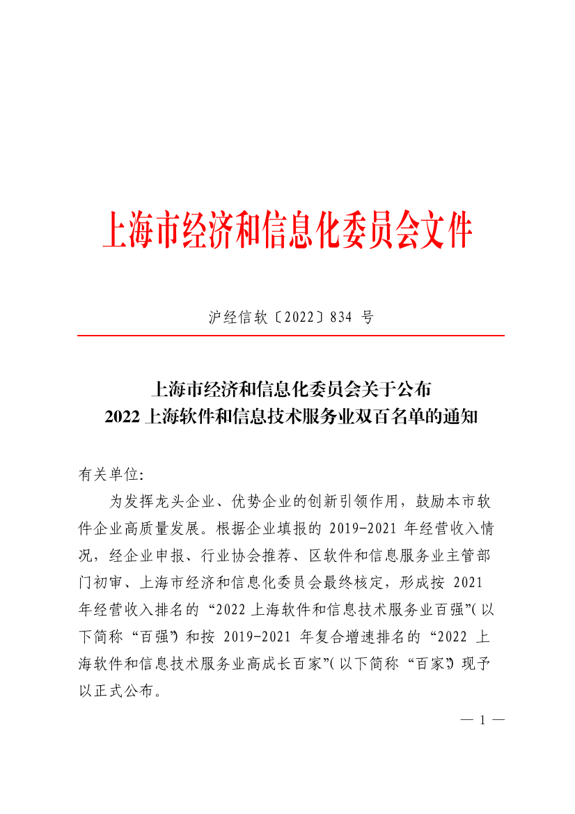 为发挥龙头企业、优势企业的创新引领作用,鼓励本市软件企业高质量发展。根据企业填报的2019-2021年经营收入情况,经企业申报、行业协会推荐、区软件和信息服务业主管部门初审、上海市经济和信息化委员会最终核定,形成按2021年经营收入排名的“2022上海软件和信息技术服务业百强”(以下简称“百强”)和按2019-2021年复合增速排名的“2022上海软件和信息技术服务业高成长百家”(以下简称“百家”),现予以正式公布。