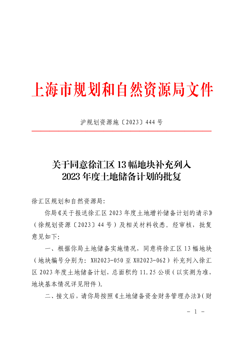 一、根据你局土地储备实施情况,同意将徐汇区13幅地块(地块编号分别为:XH2023-050至XH2023-062)补充列入徐汇区2023年度土地储备计划,总面积约11.25公顷(以实测为准,地块基本情况详见附件)。