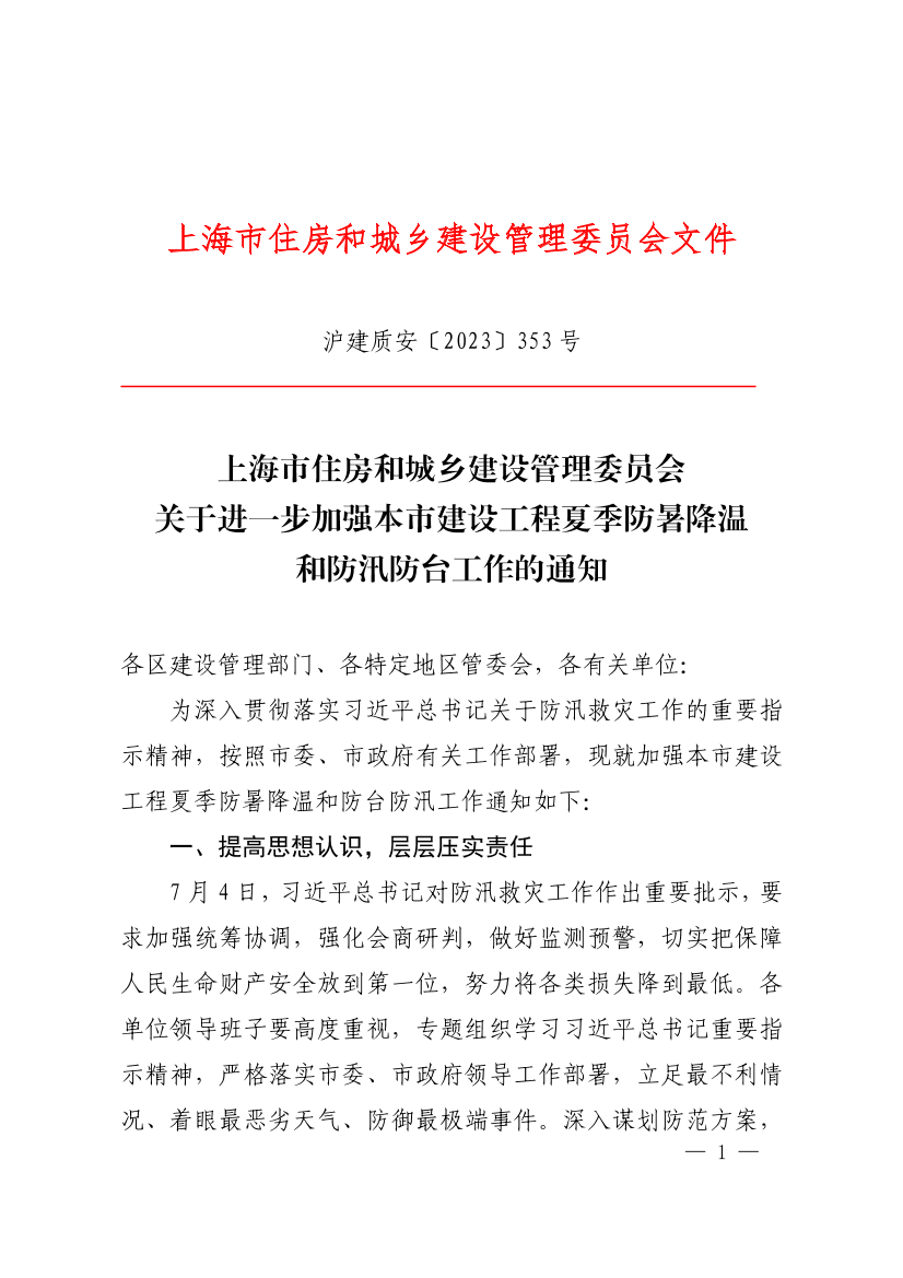 为深入贯彻落实习近平总书记关于防汛救灾工作的重要指示精神,按照市委、市政府有关工作部署,现就加强本市建设工程夏季防暑降温和防台防汛工作通知如下: